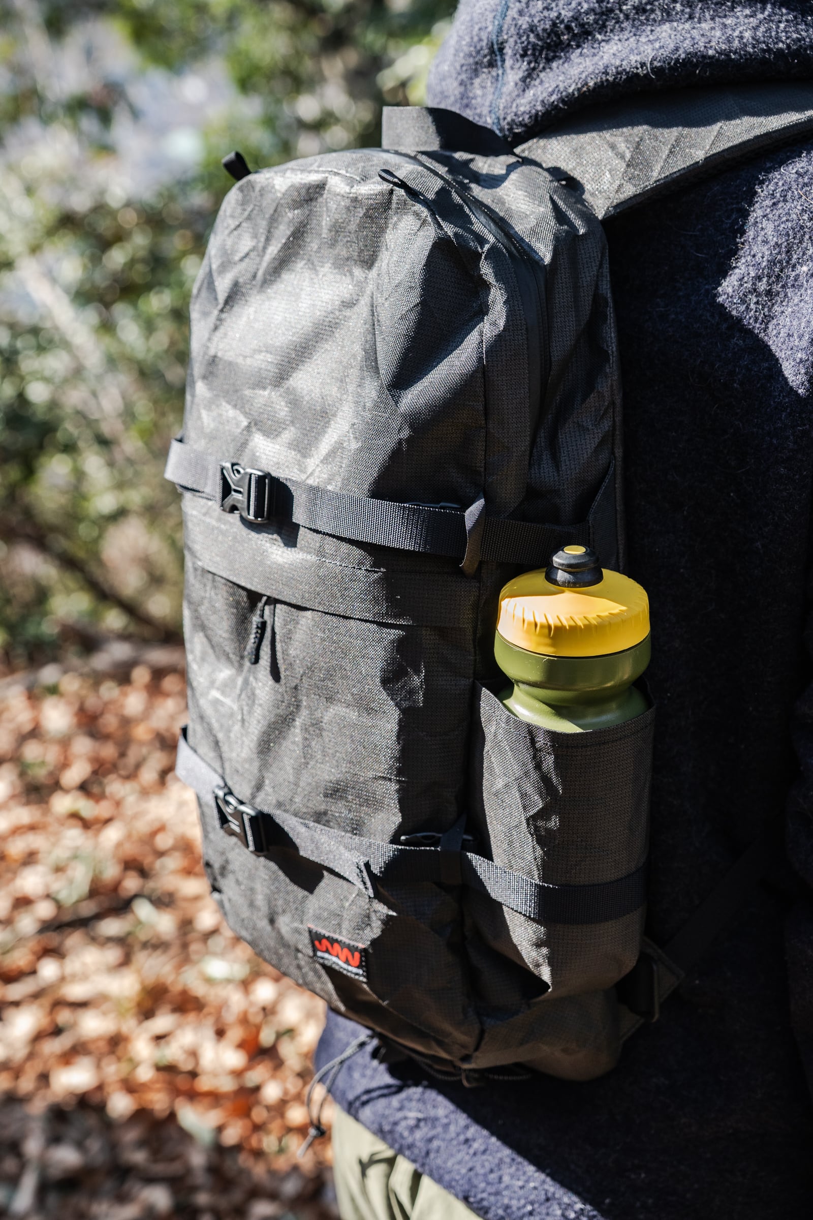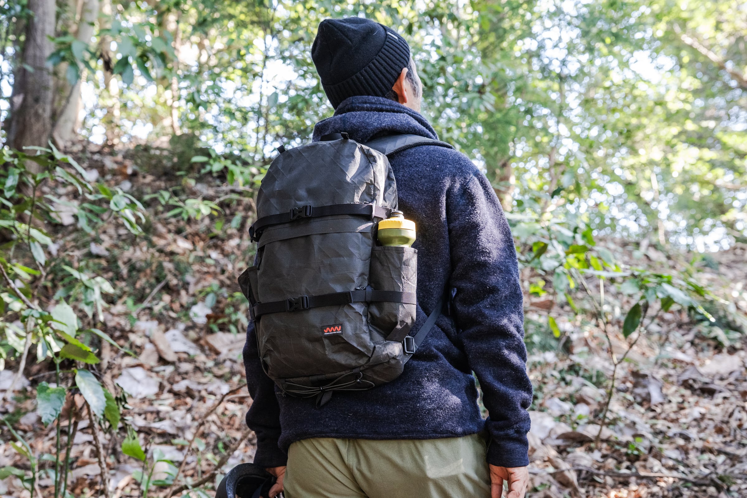 藪漕ぎの時、破れたりほつれたりしやすいメッシュポケットでは無く、ボディと同生地で作られています。もちろん、500mlのウォーターボトルも入るサイジングになっていますが、あくまでもギアポケットとしてデザインされています。